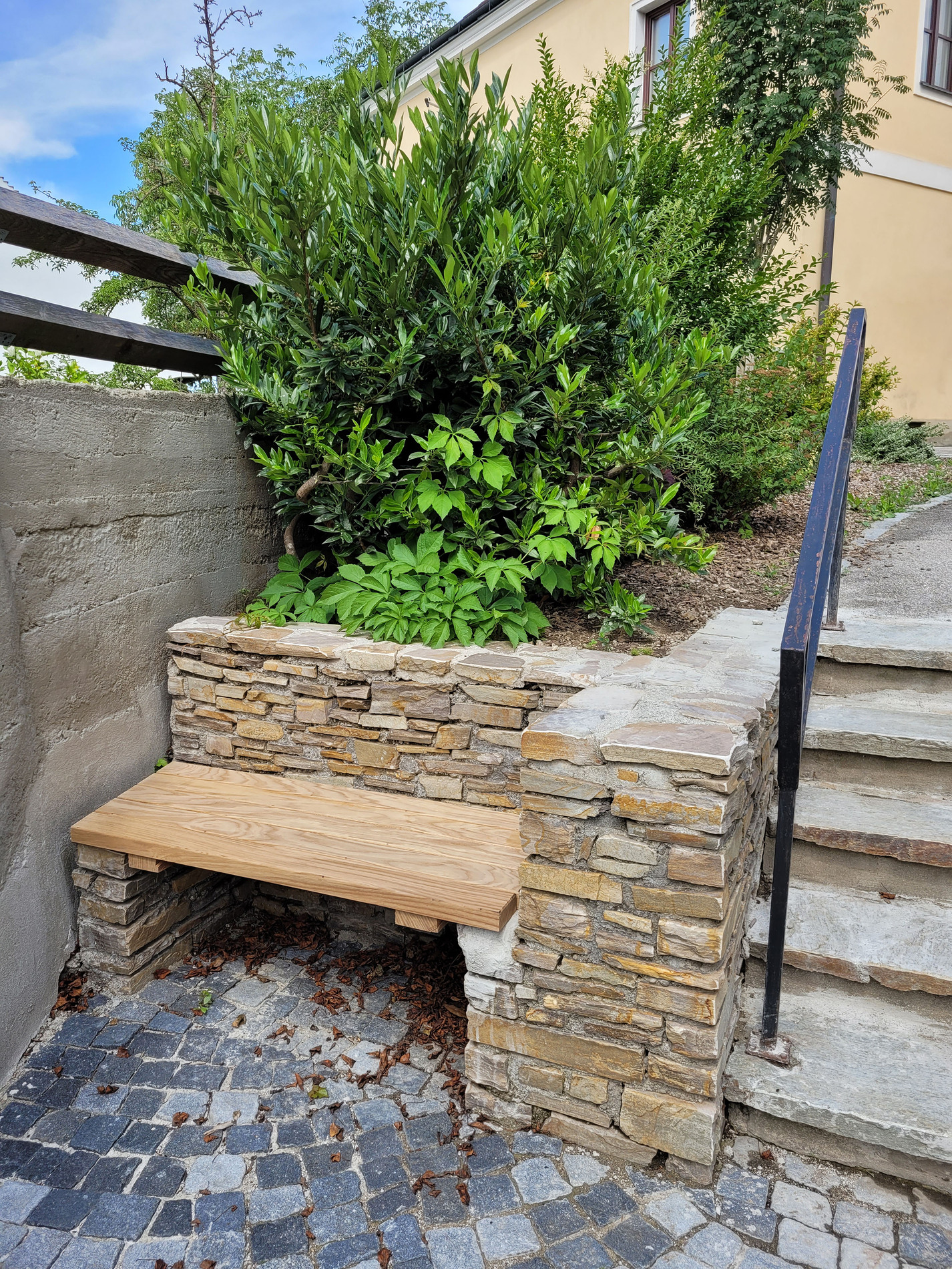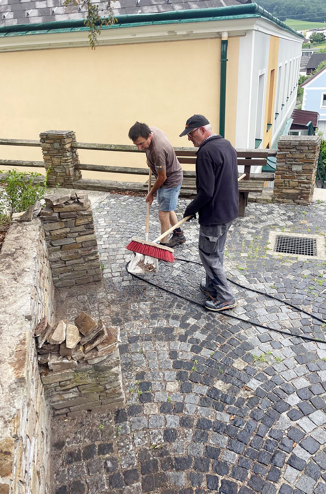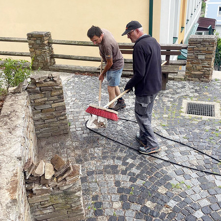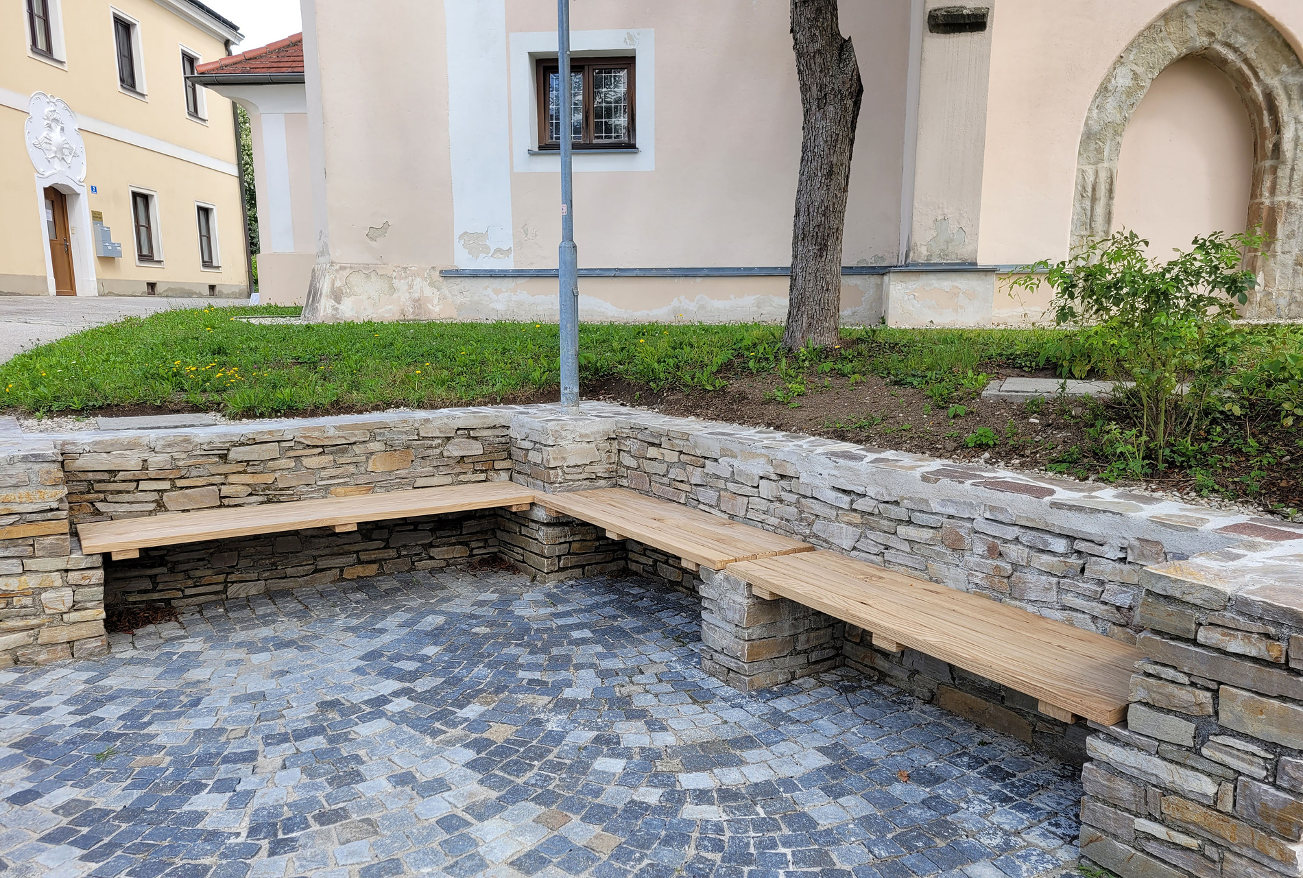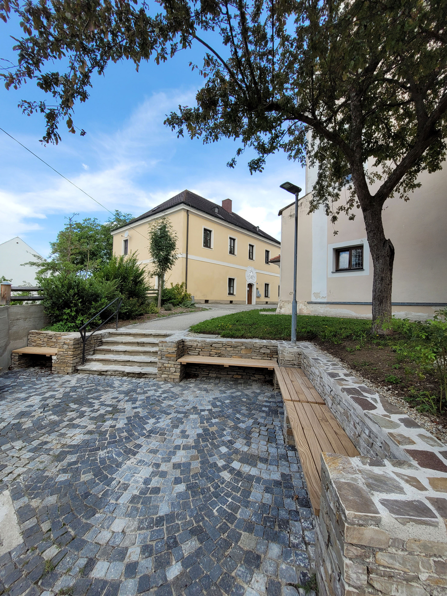 Anlässlich des runden Geburtstages unserer Frau Bürgermeisterin hat der ÖKB Bischofstetten den Abgang unter der Kirche renoviert. Die losen Steine der Steinmauern und die neuen Sitzbänke verschönern unseren Vorplatz und laden zum Verweilen ein.