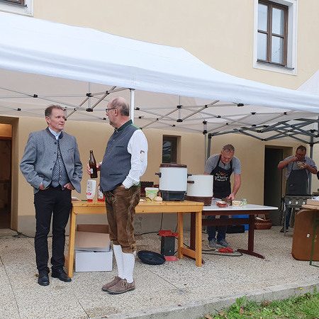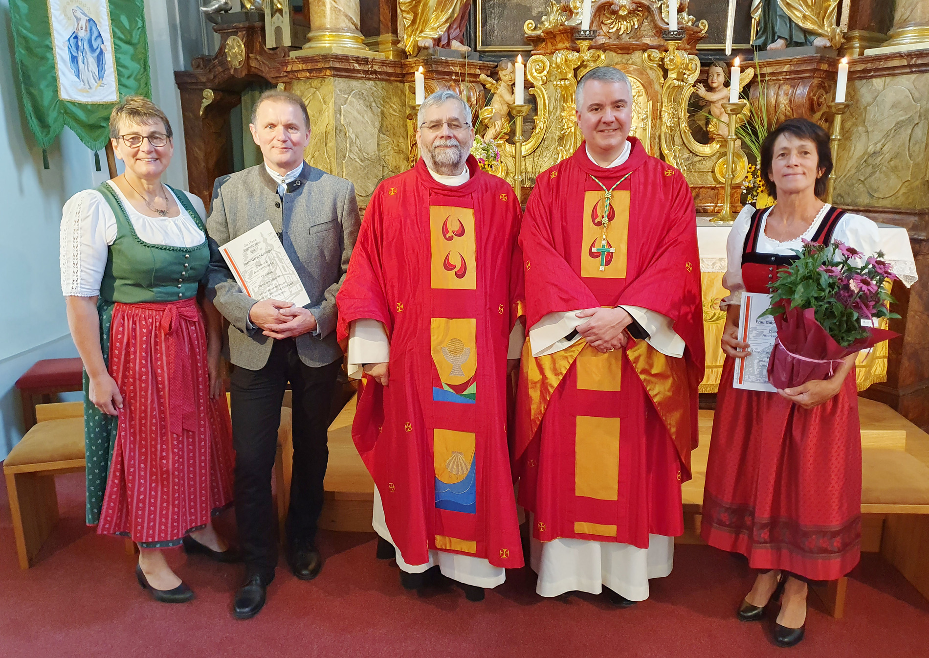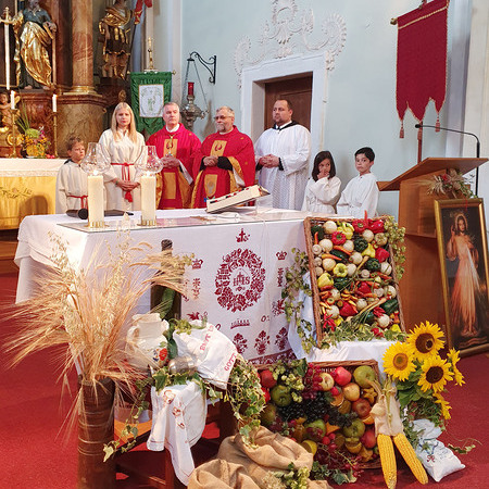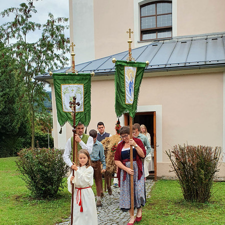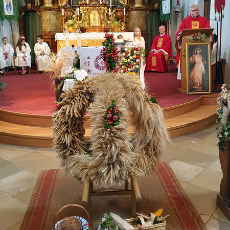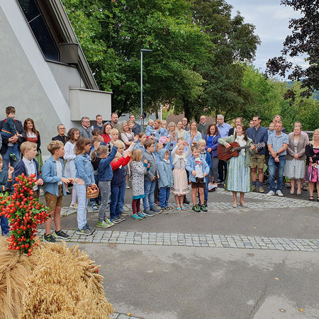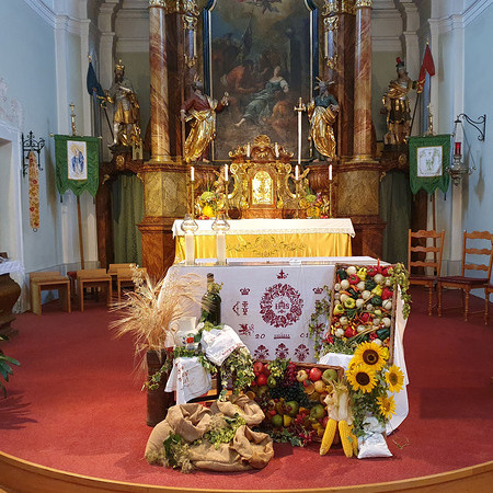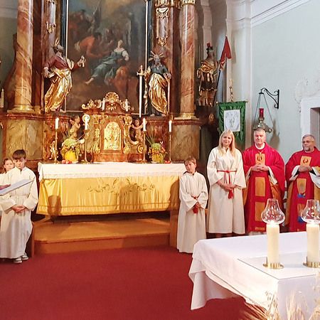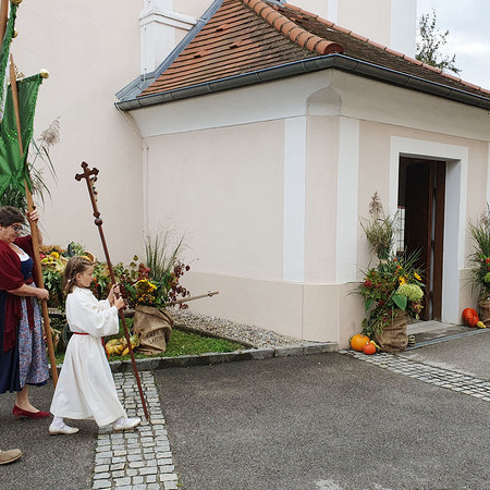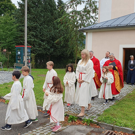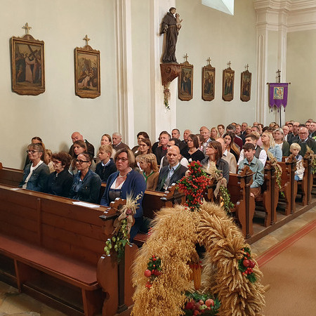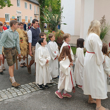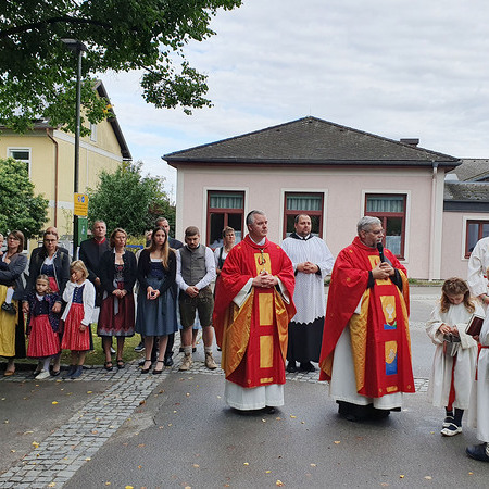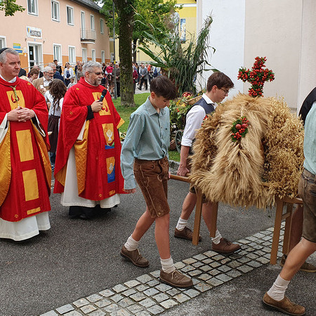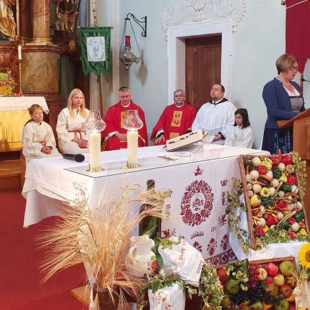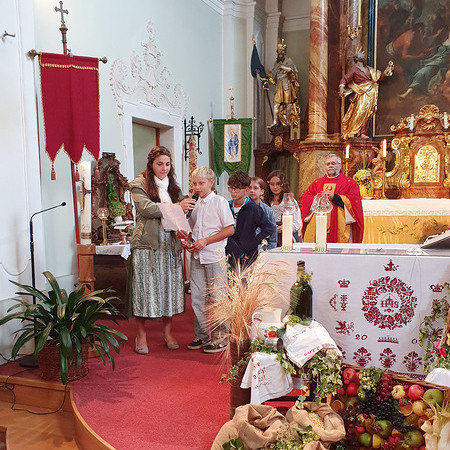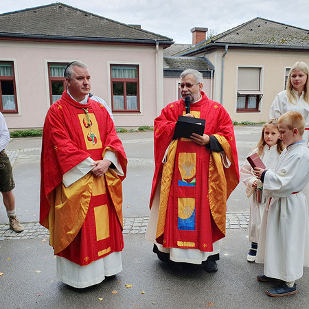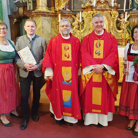Im Anschluss an die Messfeier wurde P. Christian die Statue der heiligen Agatha (Pfarrpatronin von Bischofstetten) und ein Ausflugsgutschein überreicht. Gerald Zeilinger wurde für 15 Jahre als Mesner und Ministrantenbetreuer und Gabriele Gamböck für 5 Jahre Erntekronengestaltung ausgezeichnet. Anschließend gab es im Pfarrgarten ein gemütliches Fest, zu dem die Weisenbläser des Musikvereines aufspielten.