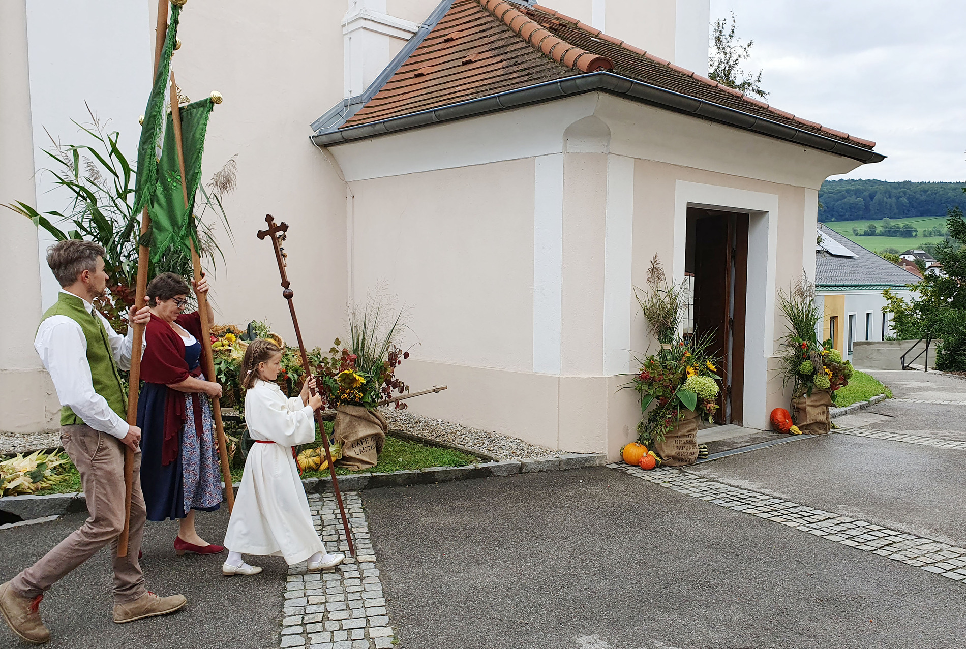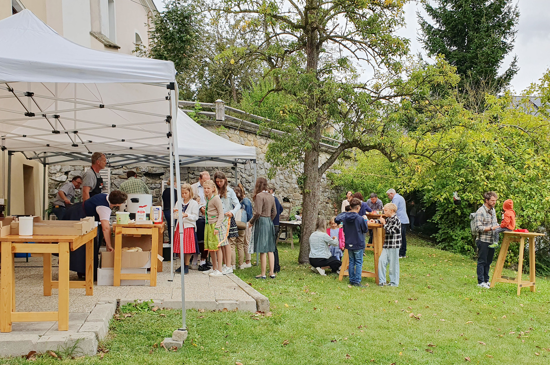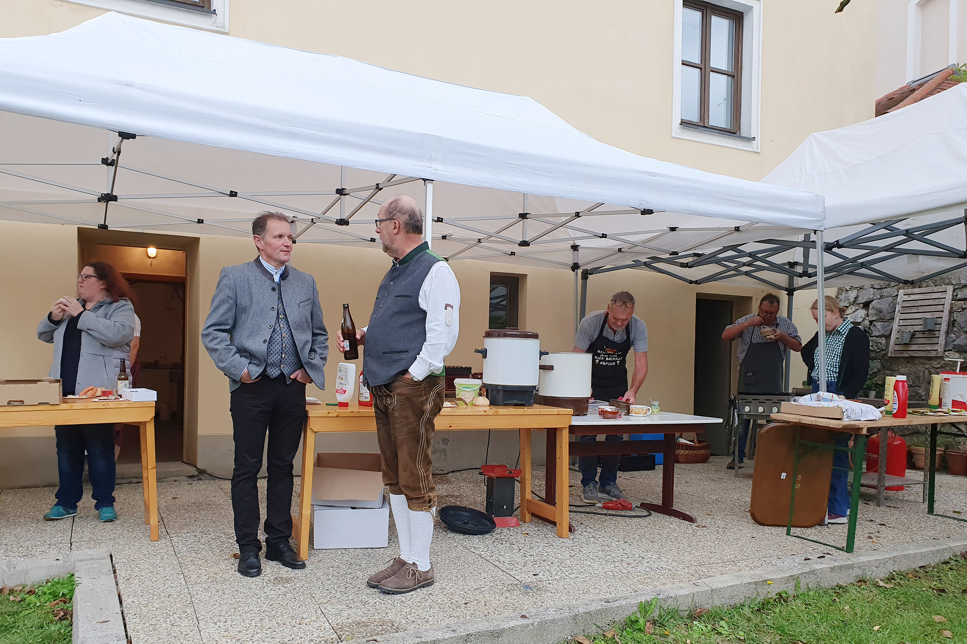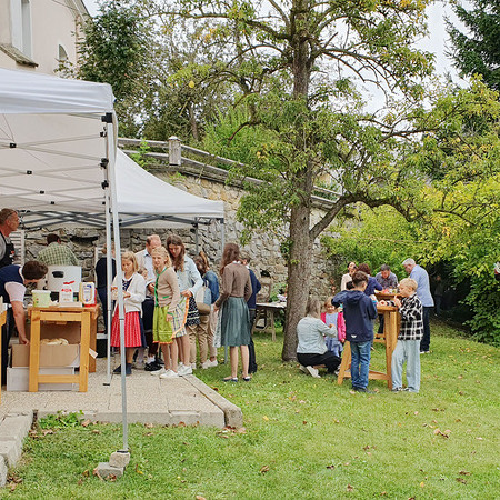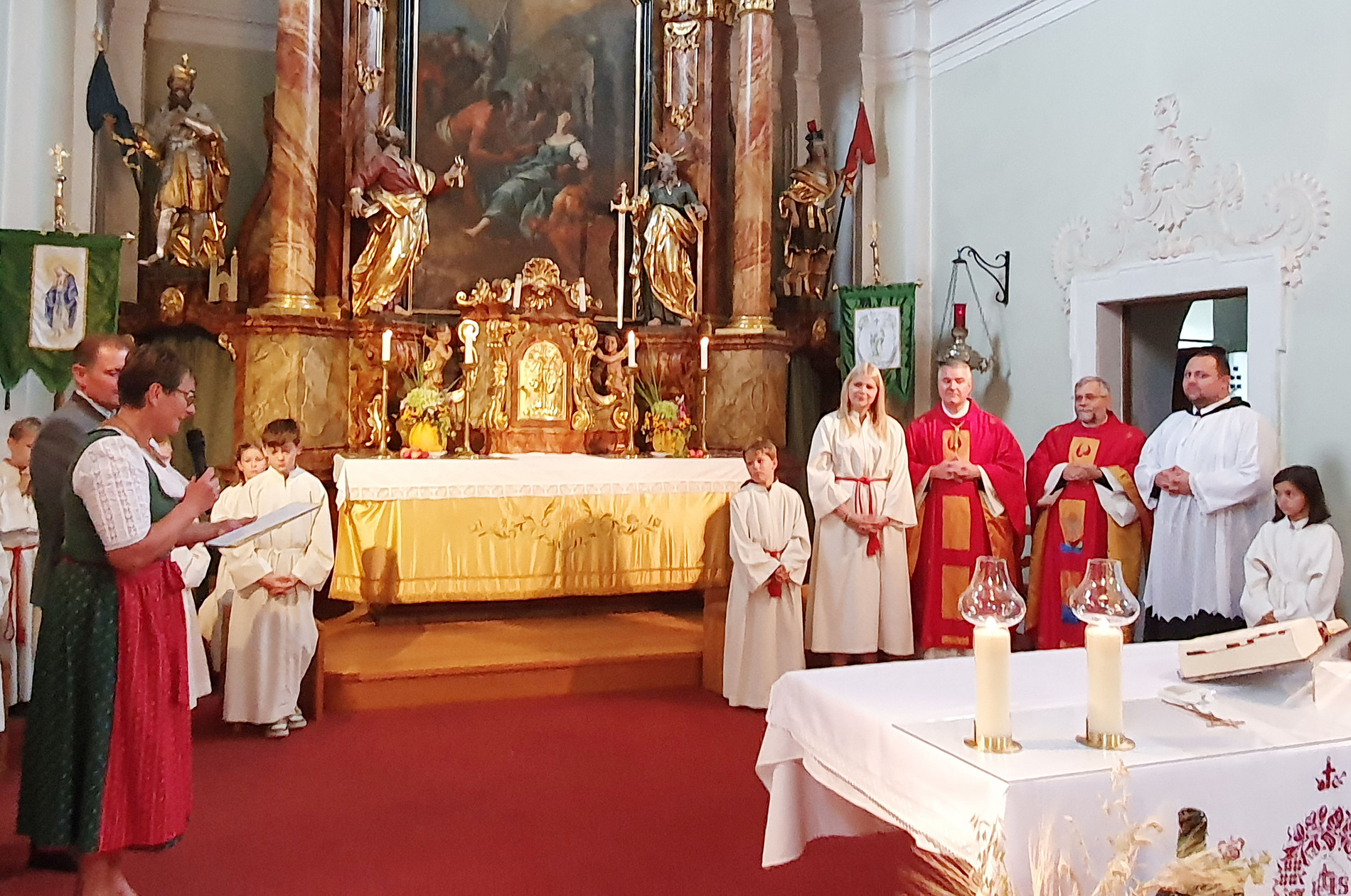 Im Anschluss an die Messfeier wurde P. Christian die Statue der heiligen Agatha (Pfarrpatronin von Bischofstetten) und ein Ausflugsgutschein überreicht. Gerald Zeilinger wurde für 15 Jahre als Mesner und Ministrantenbetreuer und Gabriele Gamböck für 5 Jahre Erntekronengestaltung ausgezeichnet. Anschließend gab es im Pfarrgarten ein gemütliches Fest, zu dem die Weisenbläser des Musikvereines aufspielten.